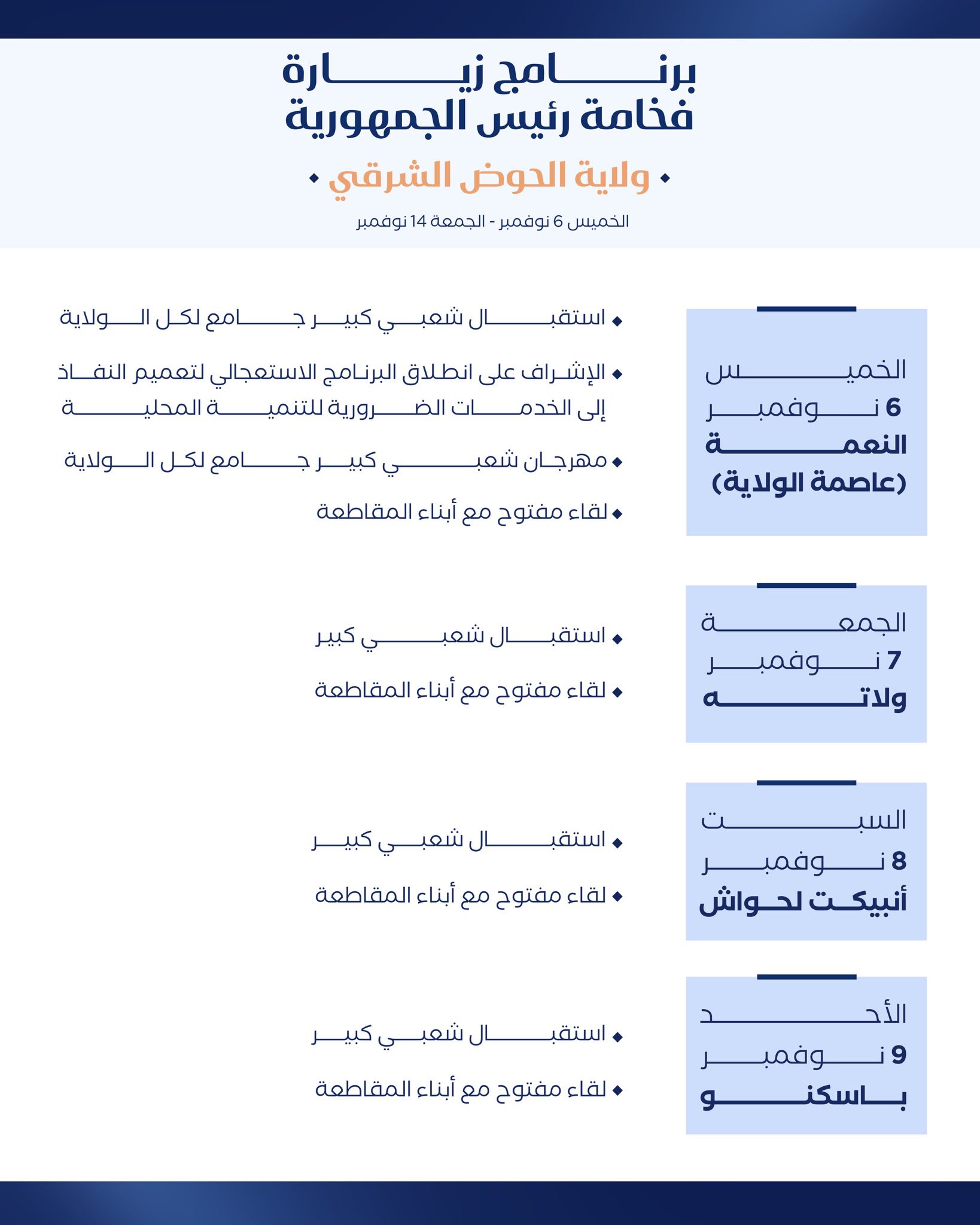 الأخبار (نواكشوط) – يُنتظر أن يبدأ الرئيس محمد ولد الغزواني غدا الخميس زيارة لولاية الحوض الشرقي تستمرُ تسعة أيام.