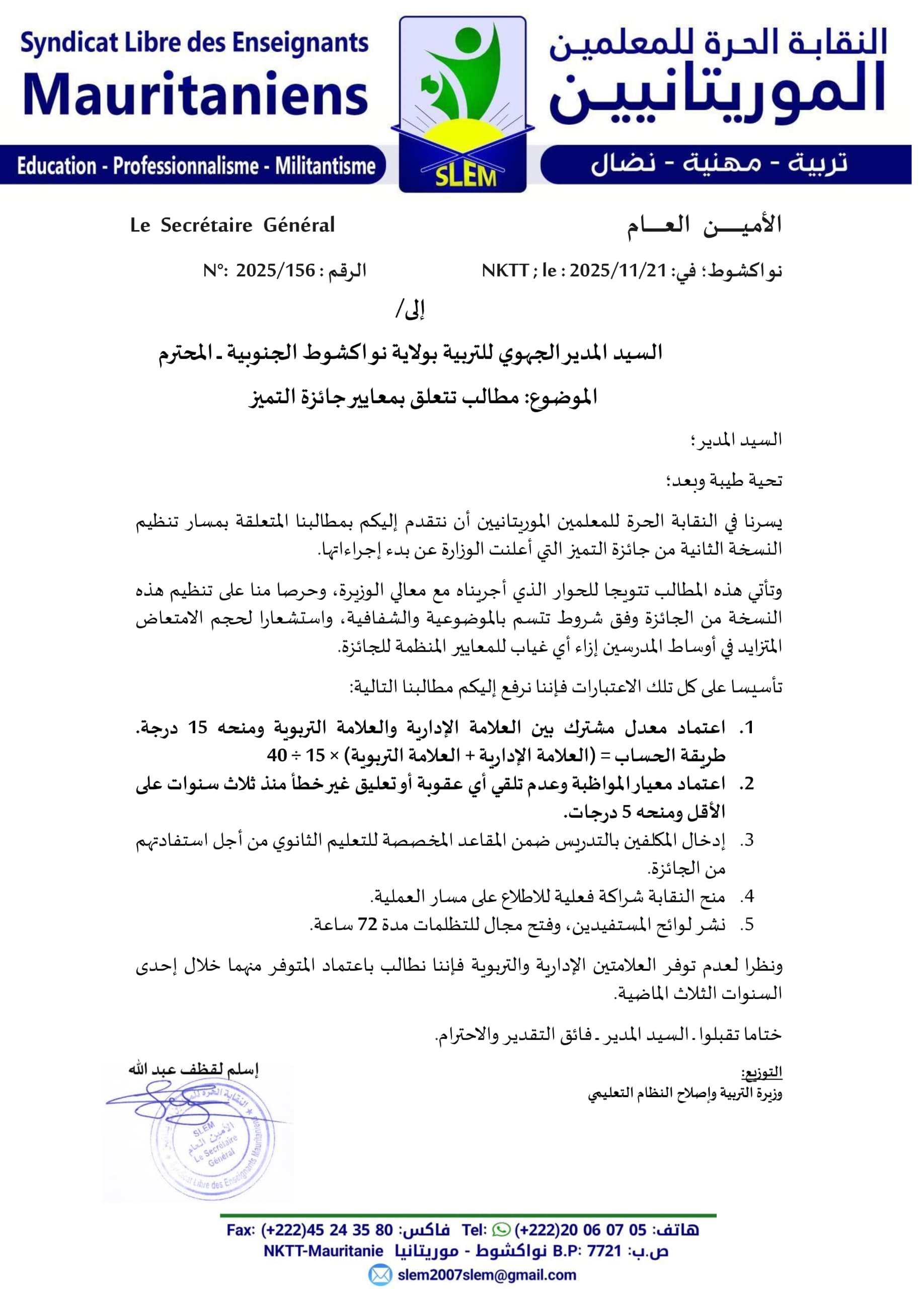 الأخبار (نواكشوط) – قدمت النقابة الحرة للمعلمين الموريتانيين تصورها للآلية التي يمكن من خلالها تطبيق المعايير المعتمدة من طرف وزارة التربية وإصلاح النظام التعليمي على النسخة الثانية من جوائز التميز.
