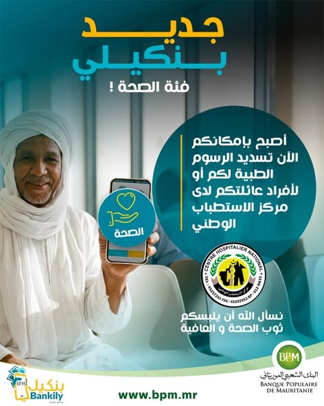 الأخبار (نواكشوط) – أعلن البنك الشعبي الموريتاني عن إضافة خدمة جديدة للخدمات المتاحة عبر تطبيق “بنكيلي” تتمثل في إمكانية دفع الرسوم الطبية عبره.