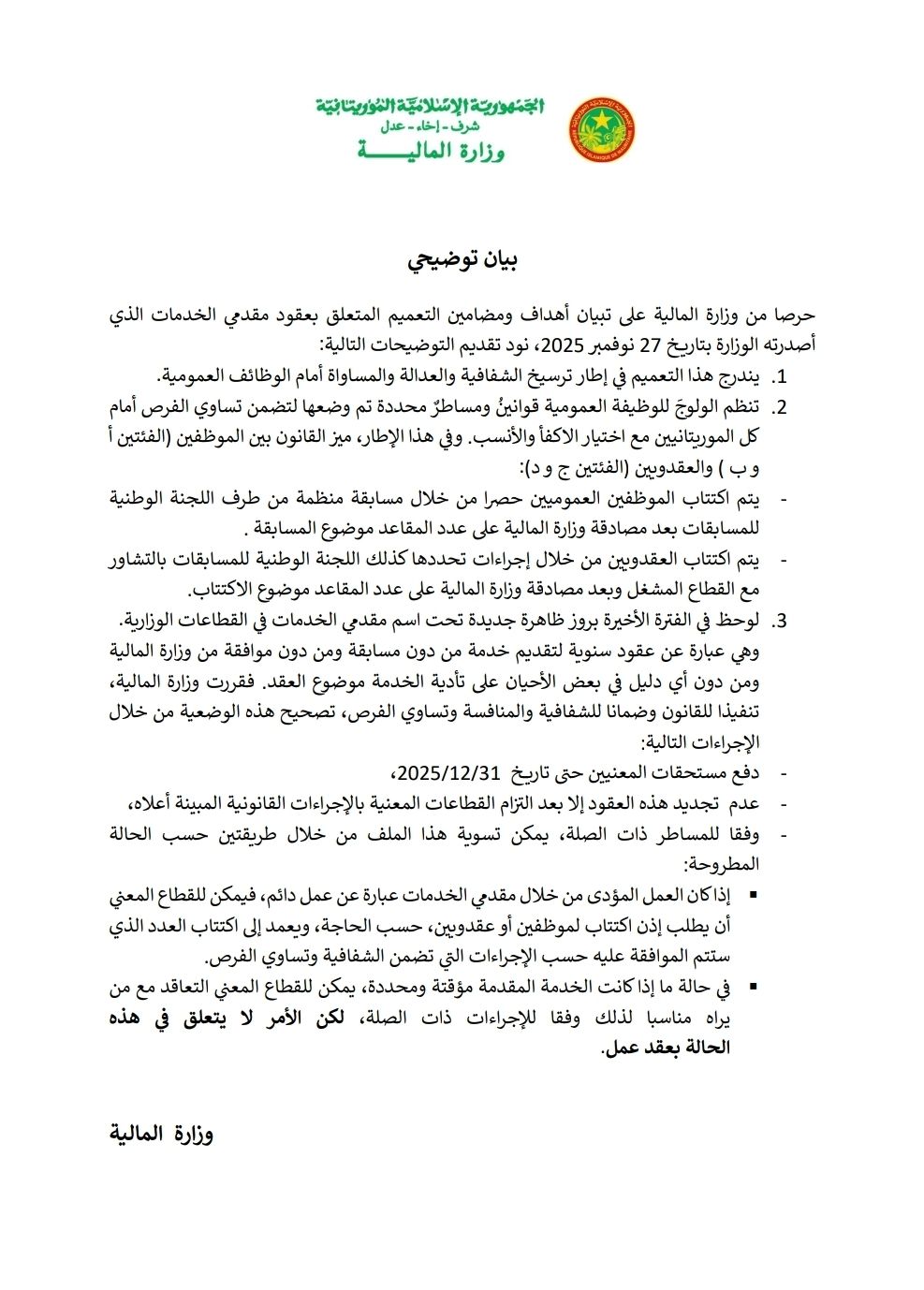الأخبار (نواكشوط) قالت وزارة المالية إن التعميم الذي أصدرته والمتعلق بعقود مقدمي الخدمات هدفه ترسيخ الشفافية والعدالة والمساواة أمام الوظائف العمومية.