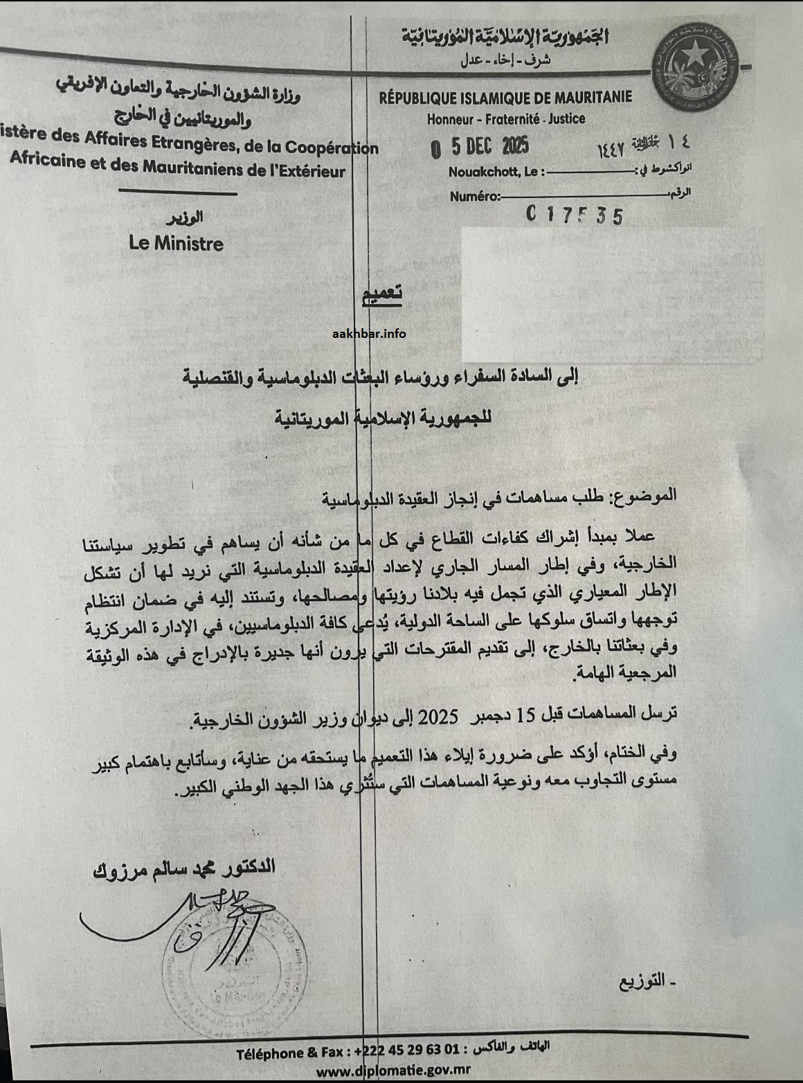ودعا ولد مرزوك – في التعميم الصادر يوم 05 ديسمبر الجاري – الدبلوماسيين لإرسال مساهماتهم قبل يوم الاثنين 15 ديسمبر 2025.