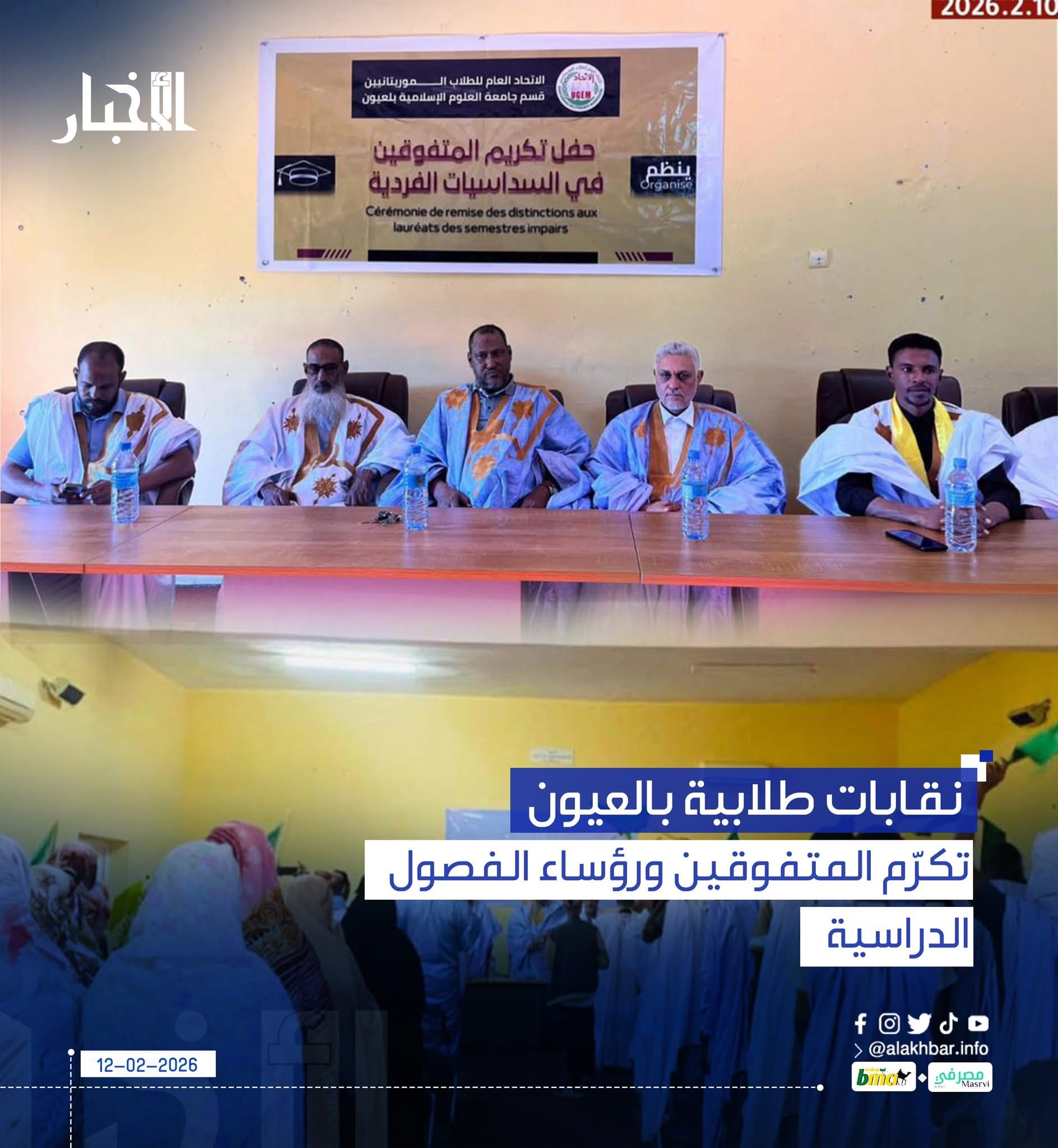 الأخبار (العيون) - كرّم قسما نقابتا الاتحاد العام للطلاب الموريتانيين، والاتحاد الوطني لطلبة موريتانيا بجامعة العلوم الإسلامية بالعيون، المتفوقين في السداسيات الفردية، إضافة لرؤساء الفصول الدراسية.