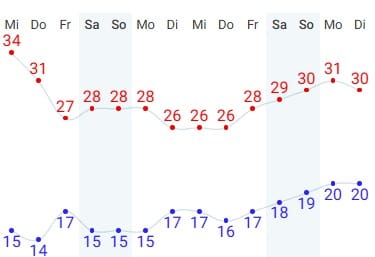 ومن المتوقع أن تسجل العاصمة أدنى درجات حرارة عظمى لها خلال منتصف الأسبوع المقبل (أيام الثلاثاء والأربعاء والخميس)، حيث ستنخفض لتصل إلى 26° مئوية.