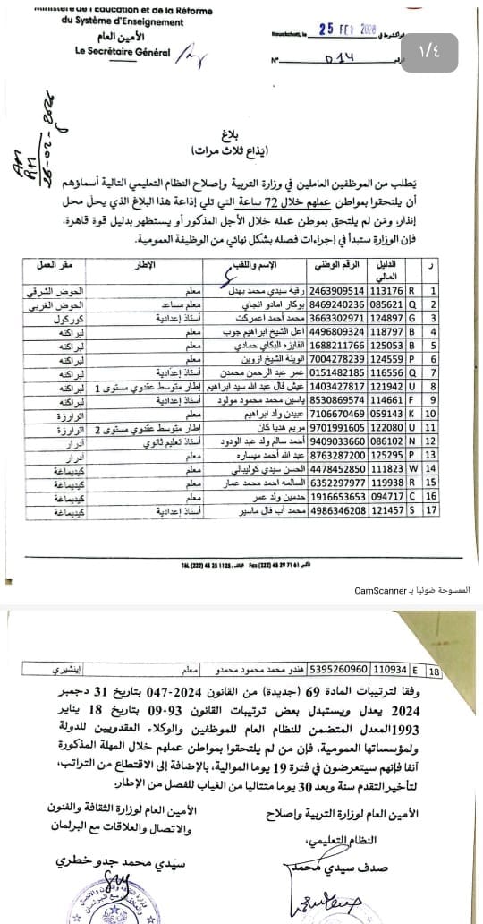 الأخبار (نواكشوط) – لوحت وزارة التربية وإصلاح النظام التعليمي بفصل 17 موظفا في القطاع إذا لم يلتحقوا بمقار عملهم خلال 72 ساعة.