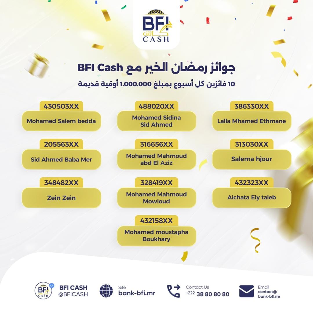 الأخبار (نواكشوط) أعلنت خدمة BFI Cash (التابعة لبنك التمويل والاستثمار BFI) رسمياً عن نتائج سحب الأسبوع الأول من حملتها الرمضانية السنوية "جوائز رمضان الخير".