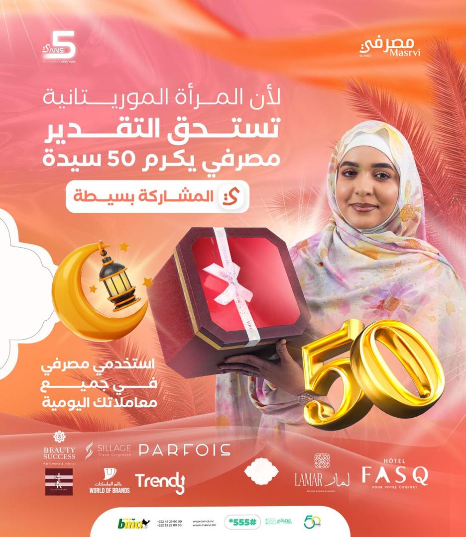 الأخبار (نواكشوط) – أعلن تطبيق "مصرفي" عن مبادرة وصفها بغير المسبوقة لـ"تكريم 50 امرأة تقديراً لوفائهن وثقتهن الدائمة".