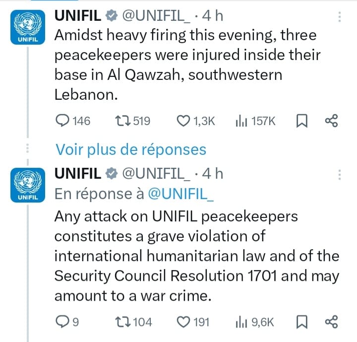 وأعربت المنسقة الخاصة للأمم المتحدة في لبنان جانين هينيس بلاسخارت في منشور على منصة إكس، عن "استيائها" لتعرض الجنود الغانيين لإصابات.