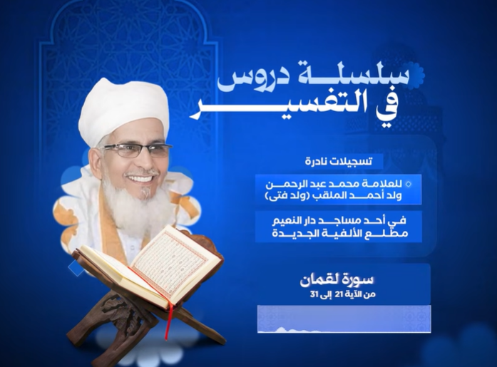 من أرشيف الدروس القرآنية النادرة، نستمع لتفسير سورة لقمان من الآية 21 إلى31 مع العلامة محمد عبد الرحمن ولد أحمد الملقب ولد فتى في دروس ألقاها مطلع الألفية الجديدة في أحد مساجد دار النعيم