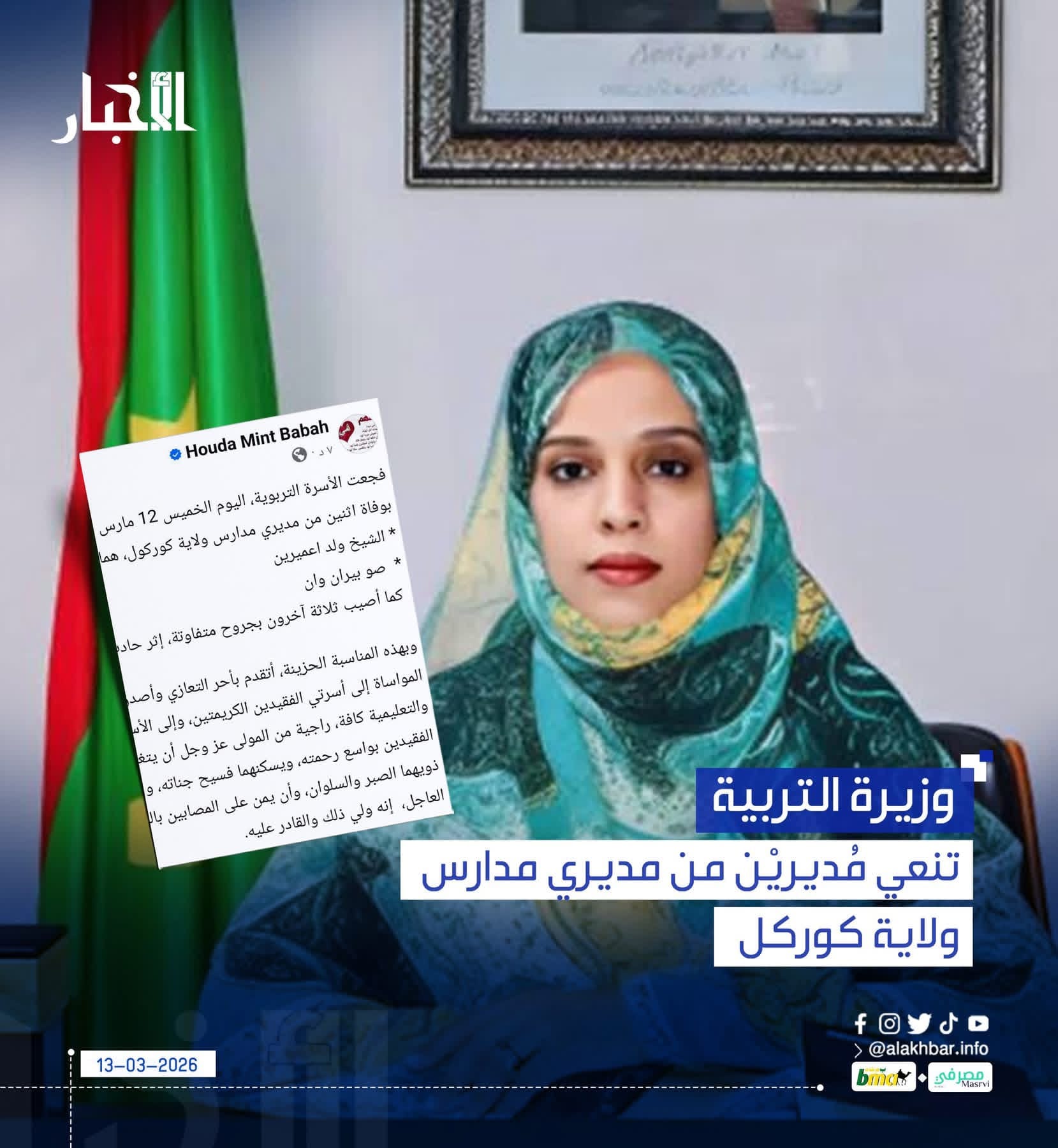 الأخبار (نواكشوط) – نعت وزيرة التربية وإصلاح النظام التعليمي هدى باباه مديريْن من مديري المدارس العمومية في ولاية كوركل جنوب البلاد، هما الشيخ ولد اعميرين وصو بيران وان، وذلك خلال حادث سير أليم.