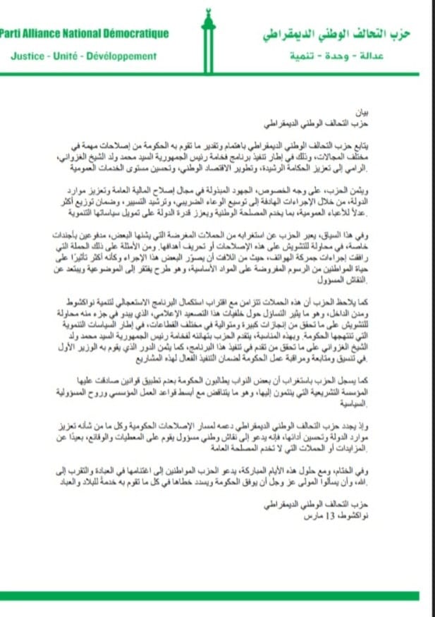 وقال الحزب إنه يتابع باهتمام وتقدير ما تقوم به الحكومة من إصلاحات مهمة في مختلف المجالات، وذلك في إطار تنفيذ برنامج الرئيس محمد ولد الغزواني، الرامي إلى تعزيز الحكامة الرشيدة، وتطوير الاقتصاد الوطني، وتحسين مستوى الخدمات العمومية.