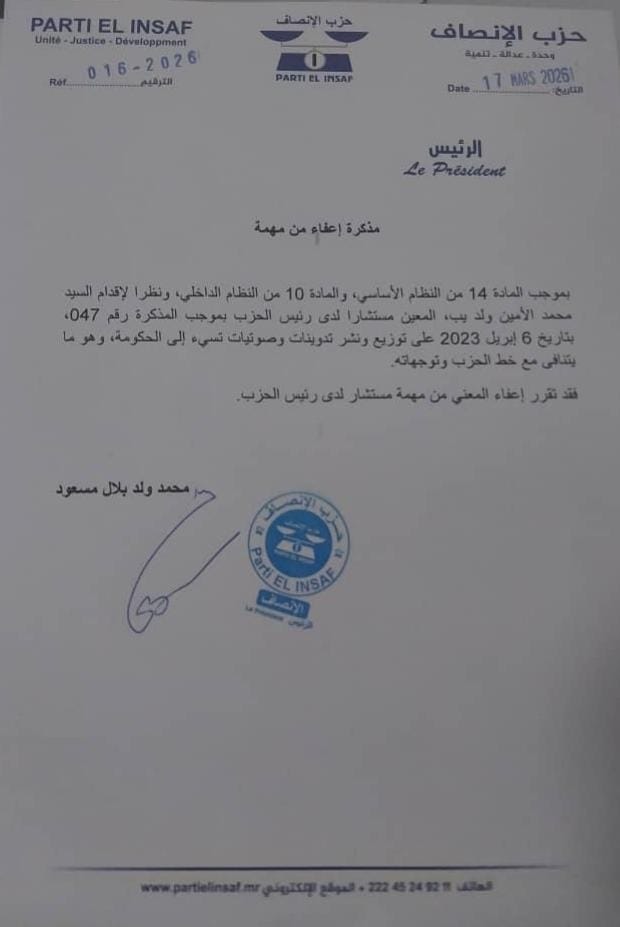 الأخبار (نواكشوط) – أعفى رئيس حزب الإنصاف الحاكم محمد ولد بلال اليوم مستشاره محمد الأمين ولد يب، بسبب ما وصفه بإساءته إلى الحكومة.