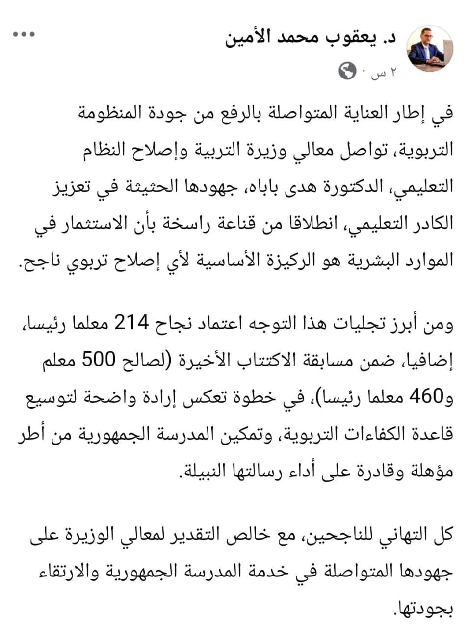 ونوه المستشار الجهود الحثيثة للوزيرة الدكتورة هدى بنت باباه في تعزيز الكادر التعليمي، انطلاقا من قناعة راسخة بأن الاستثمار في الموارد البشرية هو الركيزة الأساسية لأي إصلاح تربوي ناجح،
