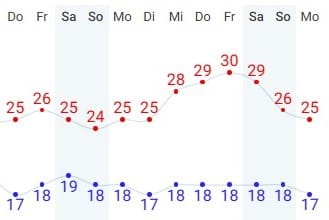 ووفق معطيات الطقس المتوفرة، فستكون درجات الحارة المتوقعة على النحو التالي: