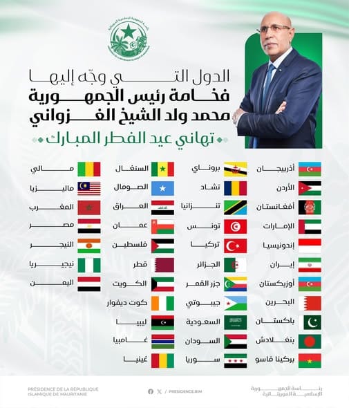 وجاءت التهنئة ضمن قائمة لأكثر من 40 رئيسا وجه لهم الرئيس ولد الغزواني التهنئة بمناسبة عيد الفطر المبارك.