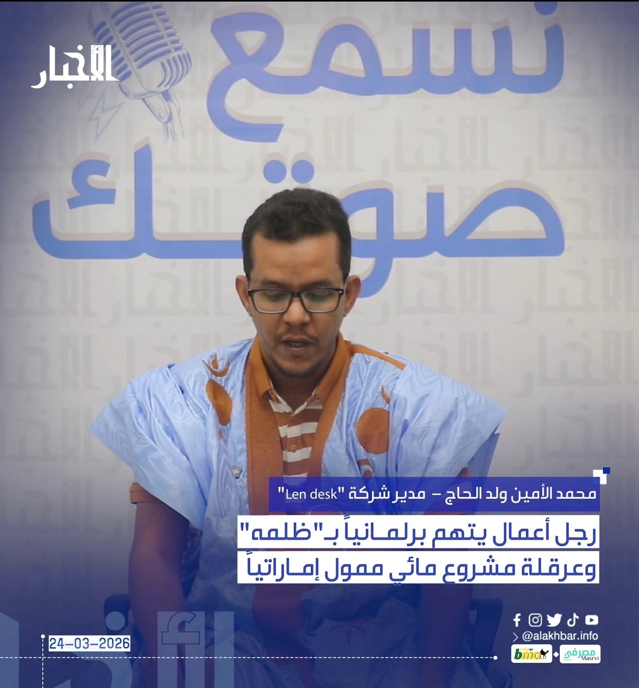 الأخبار (نواكشوط) – اتهم مدير شركة "Len desk"، محمد الأمين ولد الحاج، النائب عن دائرة نواكشوط الشمالية، زين العابدين المنير الطلبة، بظلمه، واستغلال النفوذ، لعرقلة مشروع لتزويد 165 قرية في ولايات البراكنة وتكانت والعصابة بالماء الصالح للشرب.