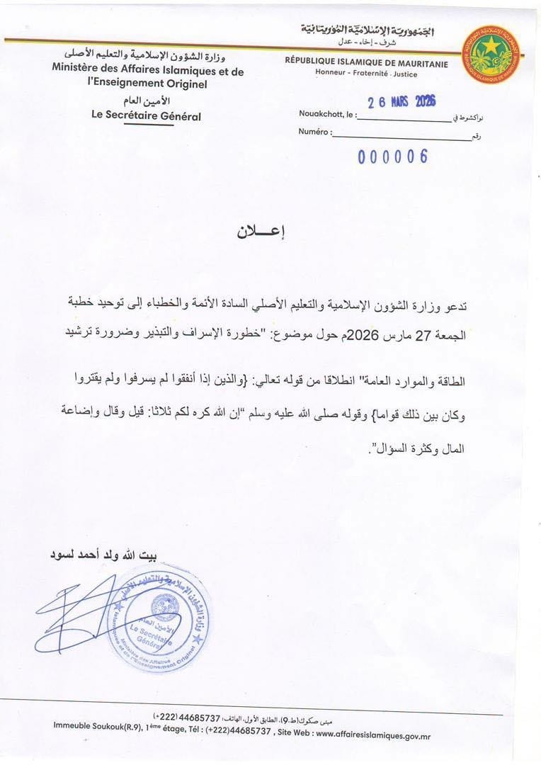 الأخبار (نواكشوط) - دعت وزارة الشؤون الإسلامية والتعليم الأصلي الأئمة والخطباء إلى توحيد خطبة الجمعة غدا حول "خطورة الإسراف والتبذير وضرورة ترشيد الطاقة والموارد العامة".