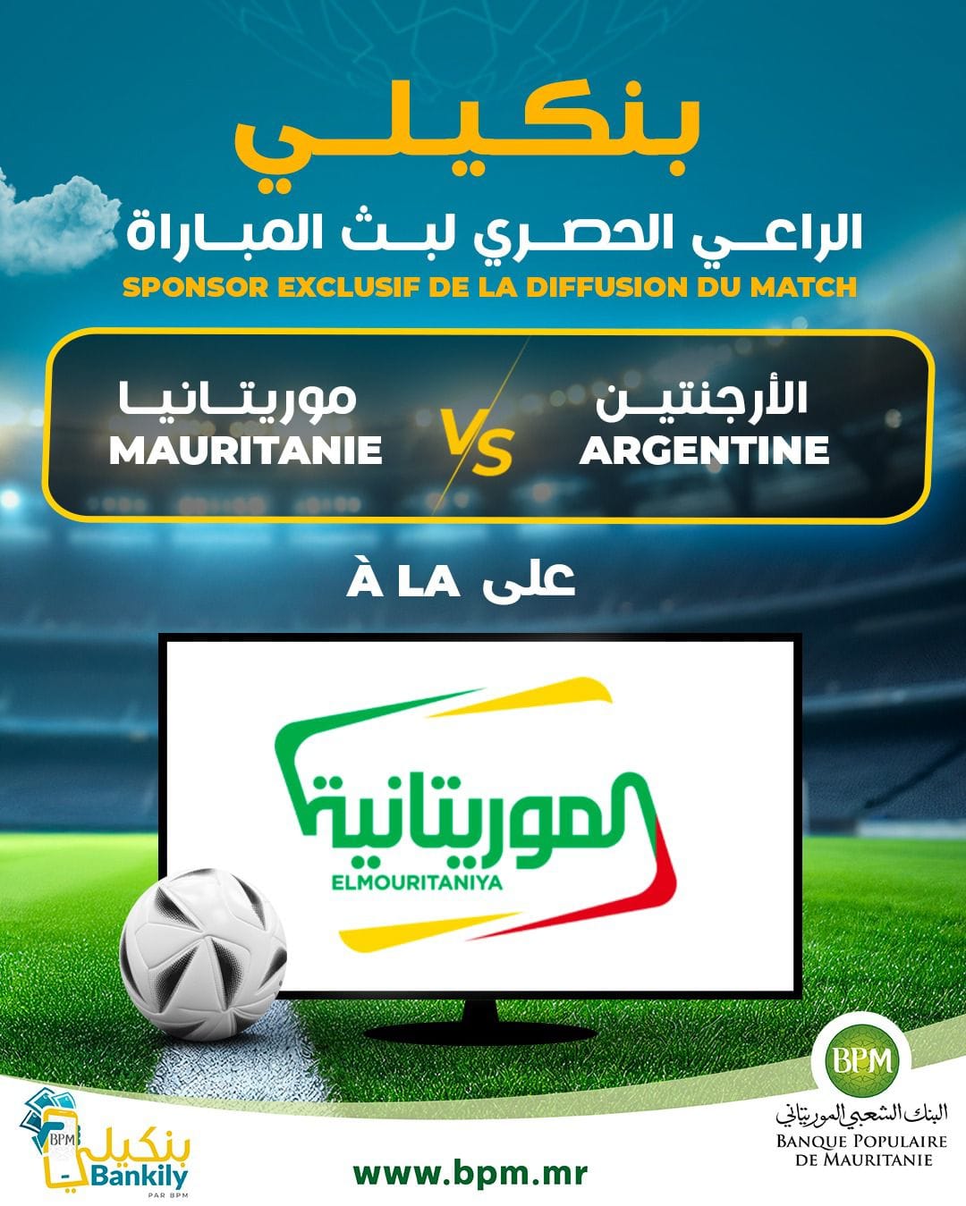 الأخبار (نواكشوط) أعلن تطبيقُ "بنكيلي" التابع للبنك الشعبي الموريتاني، رعايته الرسمية والحصرية لبث المباراة الودية التاريخية التي تجمع المنتخب الوطني الموريتاني "المرابطون" بنظيره الأرجنتيني بطل العالم المقررة الليلة.