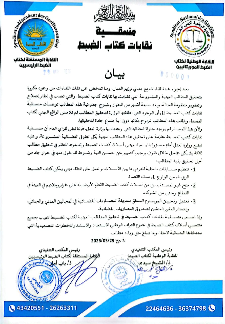 الأخبار (نواكشوط) أعلنت منسقية نقابات كتاب الضبط عن عزمها خوض مسار نضالي تصعيدي ضد وزارة العدل، متهمة إياها بالمماطلة في تنفيذ وعود وصفتها بالمكررة، وذلك بعد سبعة أشهر من الحوار المتعثر حول المطالب المهنية لمنتسبي هذا القطاع.