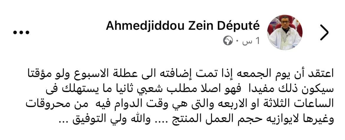 وأضاف ولد الزين في تدوينة له على فيسبوك أنّ ما تستهلكه ساعات العمل من محروقات يوم الجمعة وغيرها لا يوازيه حجم العمل المنتج.