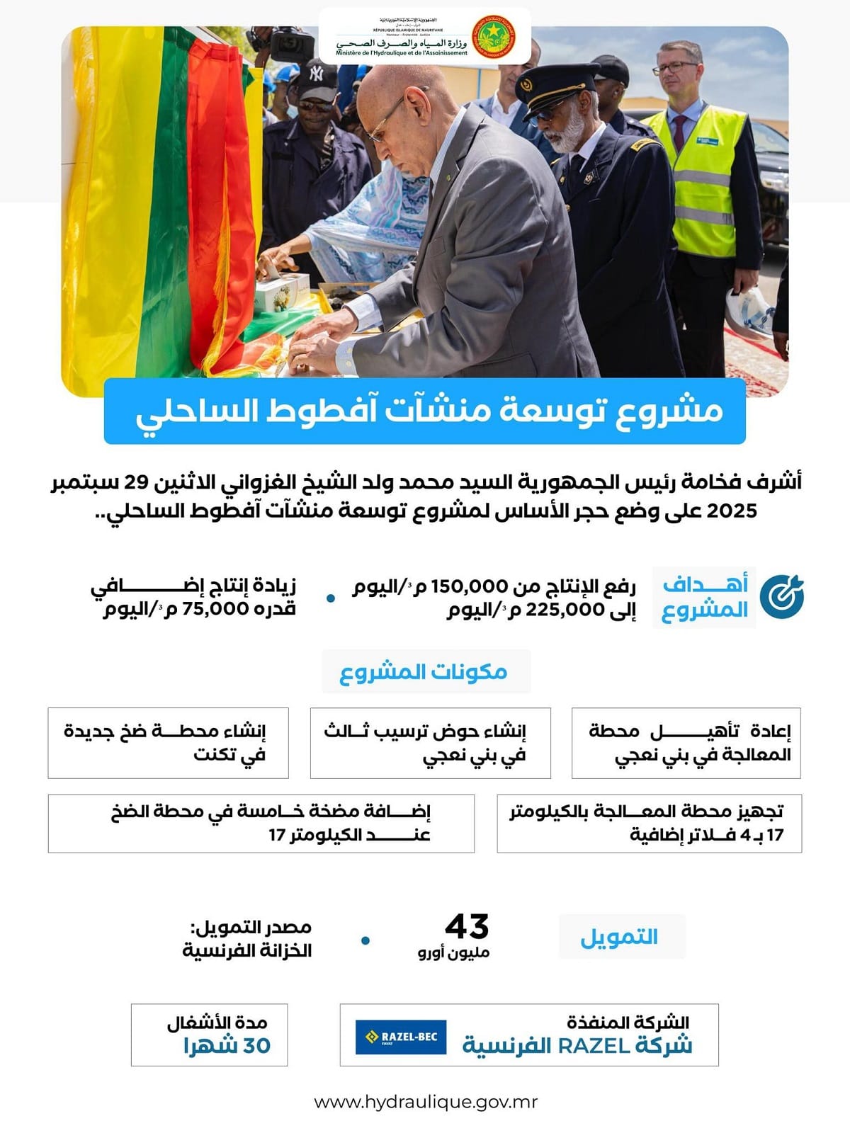 الأخبار (نواكشوط) – في يوم 29 سبتمبر 2025، أعطى الرئيس محمد ولد الغزواني إشارة انطلاق أشغال مشروع لتوسعة قدرات المعالجة والضخ في منشآت آفطوط الساحلي، بهدف تعزيز الأمن المائي للعاصمة نواكشوط، ورفع الطاقة الإنتاجية للمياه الصالحة للشرب من 150 ألف متر مكعب إلى 225 ألف متر مكعب يوميا، على أن تكتمل أشغاله في فترة لا تتجاوز 30 شهرا.
