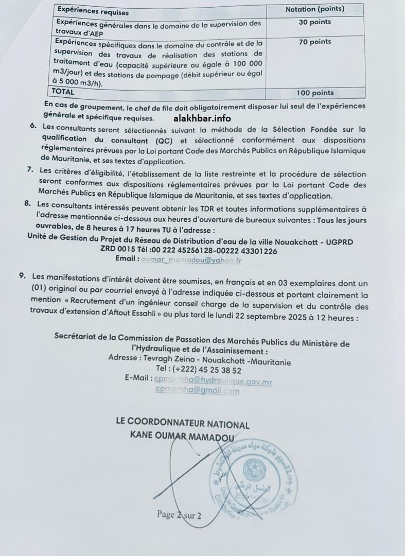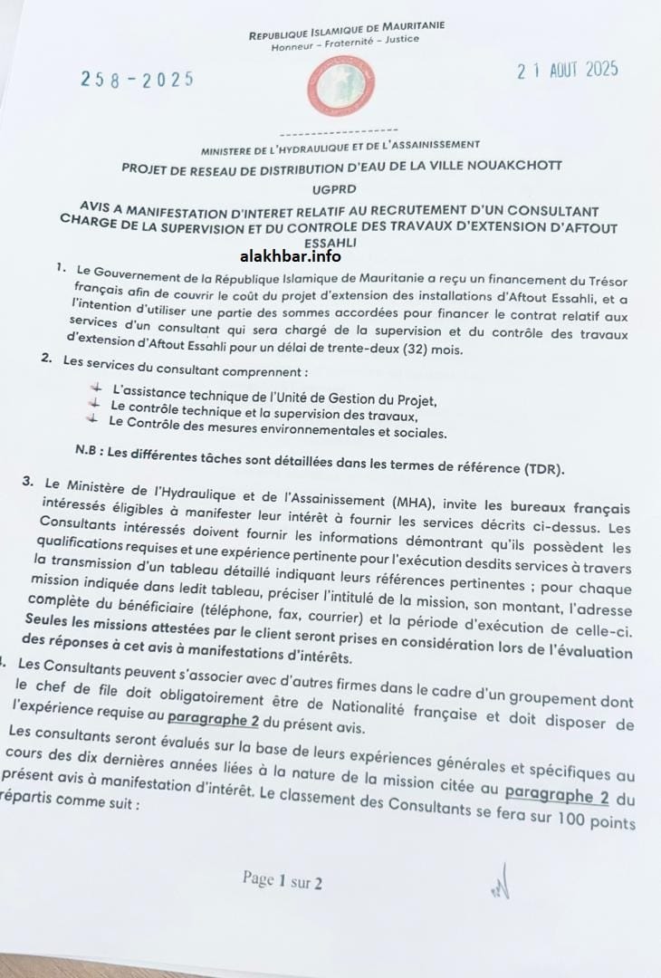في يوم 21 أغسطس 2025 أصدرت وزارة المياه والصرف الصحي عبر وحدة تسيير مشروع تعزيز الإنتاج وتوسعة شبكة التوزيع في نواكشوط إعلان "إبداء رغبة" دعت في مكاتب الدراسات الفرنسية، أو التجمعات التي يقودها مكتب دراسات فرنسي لتقديم ملفاتها للتنافس على مراقبة المشروع، وحددت يوم 22 سبتمبر موعدا لنهاية تقديم الملفات.