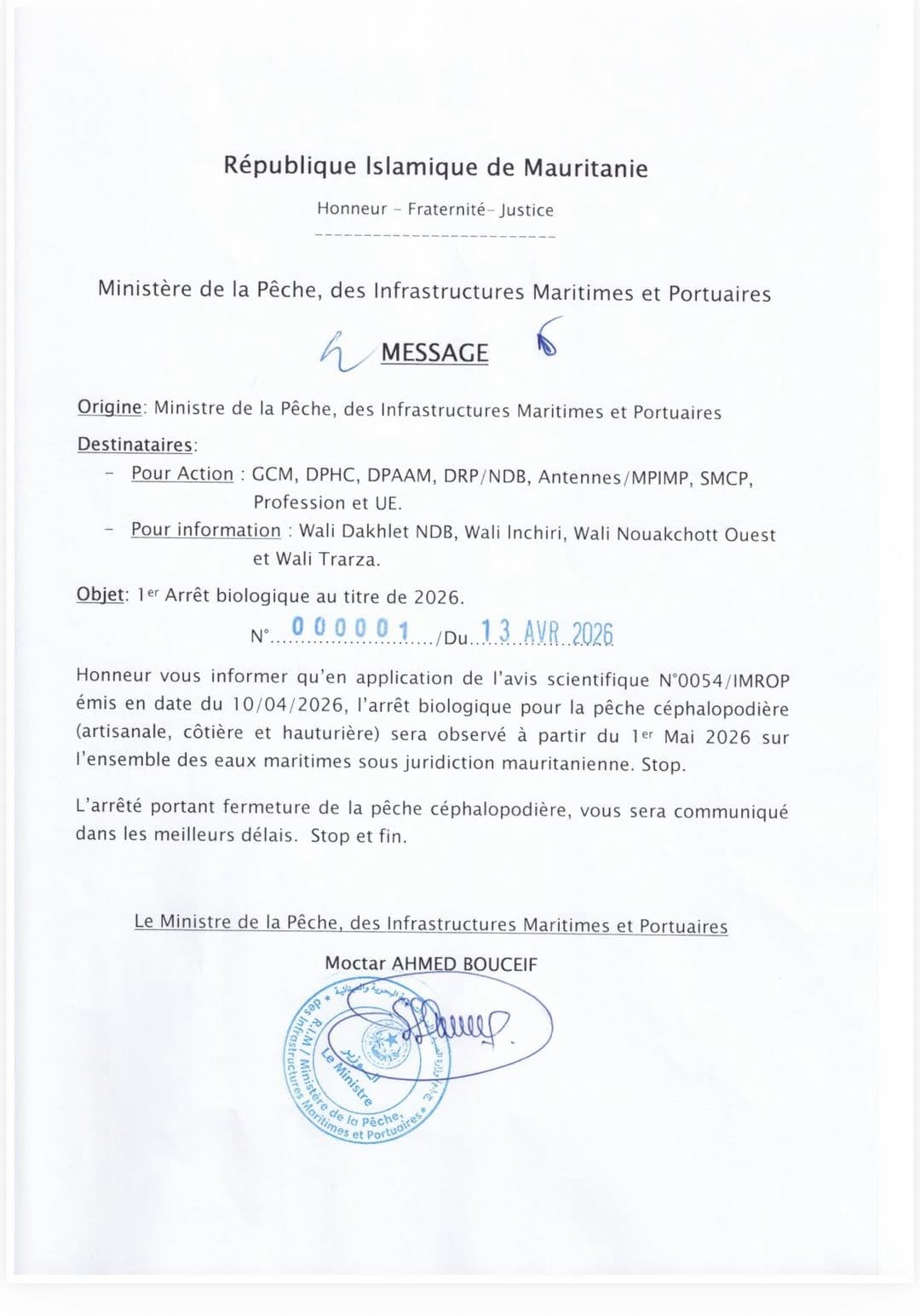 الأخبار (نواكشوط) - أعلنت وزارة الصيد والاقتصاد البحري عن إقرار توقف بيولوجي لصيد "رأسيات الأرجل"، ابتداءً من فاتح مايو 2026، على مستوى كافة المياه الإقليمية الخاضعة للسيادة الوطنية.