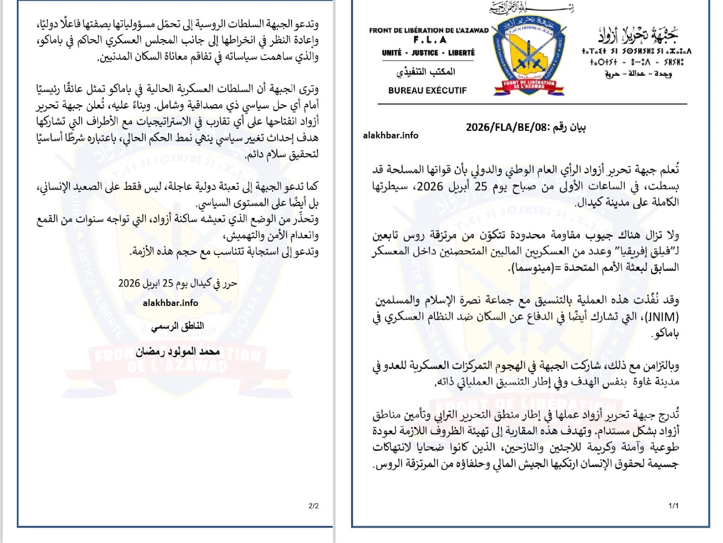 ولفتت الجبهة في البيان الذي وقعه الناطق الرسمي باسمها محمد المولود رمضان إلى وجود جيوب مقاومة وصفتها بالمحدودة تتكوّن من مرتزقة روس تابعين لـ"فيلق إفريقيا" وعدد من العسكريين الماليين المتحصنين داخل المعسكر السابق لبعثة الأمم المتحدة "مينوسما".