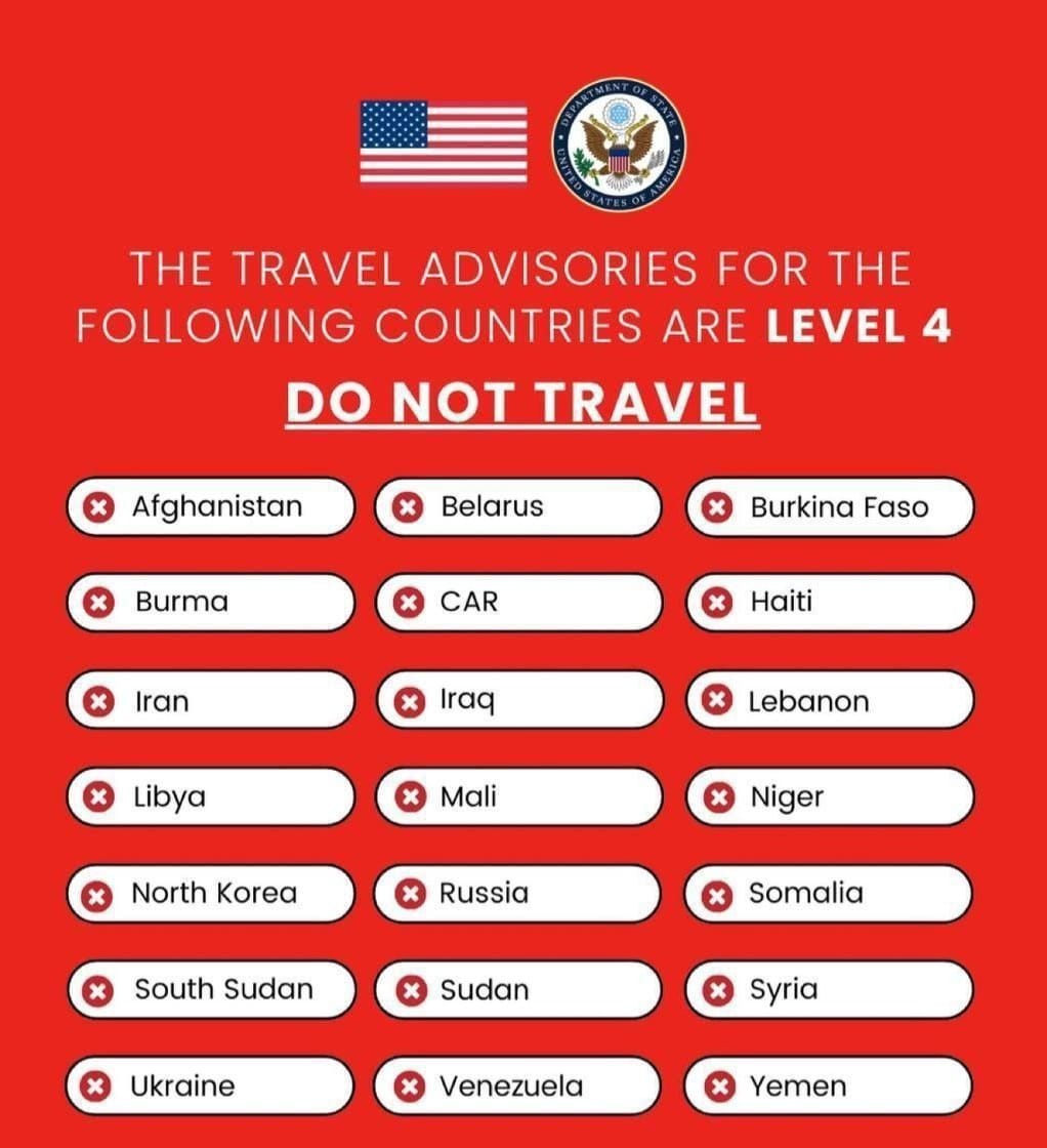 ونبهت الخارجية الأمريكية مواطنيها إلى خطورة السفر إلى هذه الدول الـ21، لدواع أمنية، ولمحدودية الحصول على المساعدات في هذه البلدان.
