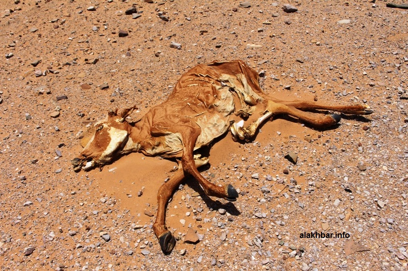 ومع تقدمك على الطريق تبدأ نذر الجفاف الذي تعرفه البلاد تطالعك بوجهها، حيث تتزايد أعداد جثث الحيوانات النافقة جراء الجفاف على جنبات الطريق، وتتزايد مع التقدم شرقا إلى ولايات لعصابه والحوضين.