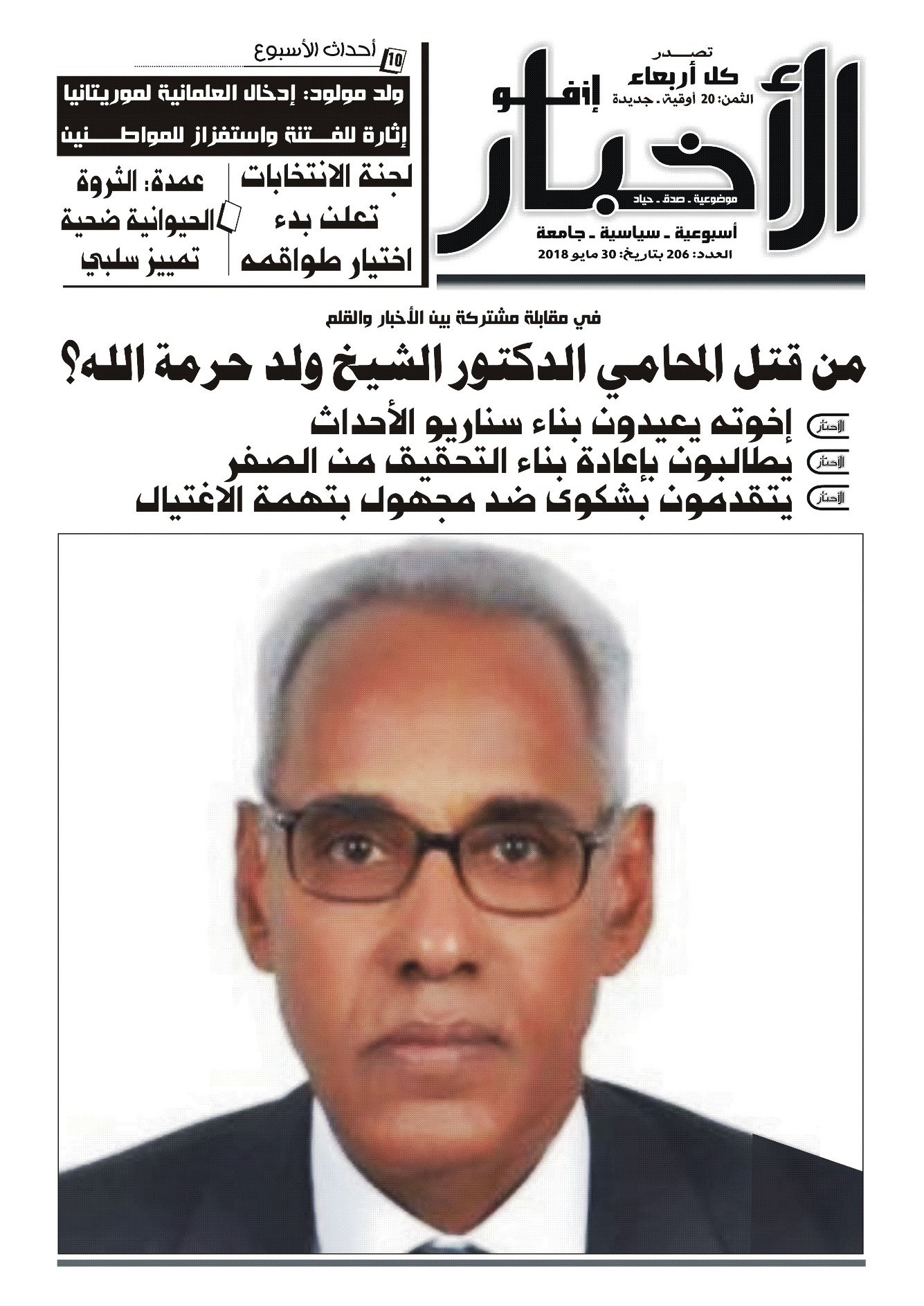 الأخبار (نواكشوط) – أجرت صحيفة الأخبار إنفو في عددها اليوم الأربعاء مقابلة مع معدي التحقيق عن حادث مقتل المحامي والدكتور الشيخ ولد حرمة الله، أعادا فيها هذا السؤال إلى المربع الأول، داعين لضرورة بناء التحقيق في الحادث الغامض الذي وقع يوم 12 مايو العام الماضي إلى نقطة السفر.