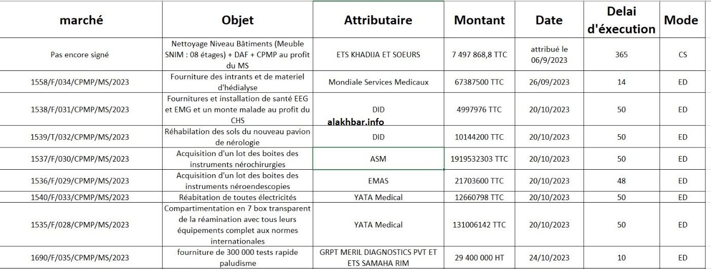 كما أن من بينها صفقة توريد وتركيب 6 أجهزة اسكانير، وبمبلغ يفوق 650 مليون أوقية، إضافة لصفقة توريد وتركيب أنبوب جهاز اسكانير في مستشفى الأمومة والطفولة، وبمبلغ يتجاوز بقليل 39 مليون أوقية قديمة.