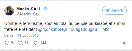 ونشر الرئيس السنغالي ماكي صال تغريدة على اتوتير عبر فيها عن "تضامنه مع الشعب البوركيني والرئيس روك مارك اكريستيان كابوري"، كما حث على "التضامن ضد الإرهاب".