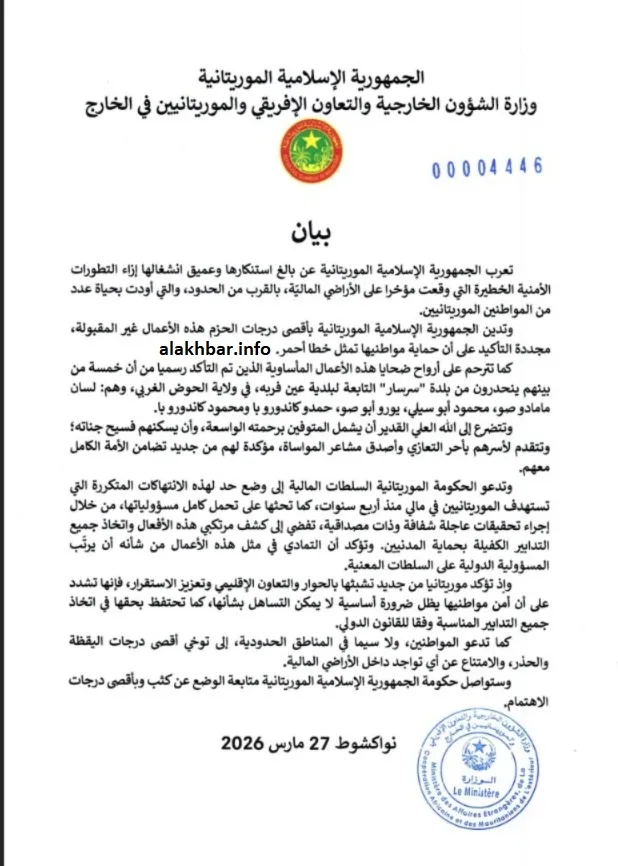 الأخبار (نواكشوط) – عبرت موريتانيا عن بالغ استنكارها وعميق انشغالها لما وصفتها بالتطورات الأمنية الخطيرة التي وقعت مؤخرا على الأراضي الماليّة، بالقرب من الحدود، وأودت بحياة عدد من المواطنين الموريتانيين. ودعت موريتانيا في بيان صادر عن وزارة الخارجية السلطات المالية إلى وضع حد لهذه الانتهاكات المتكررة التي تستهدف الموريتانيين في