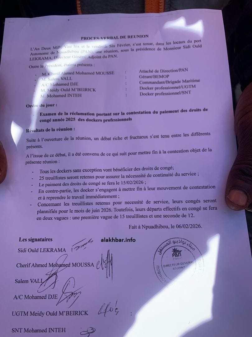 ونص الاتفاق على أنه بخصوص عمال الرافعات المحتفظ بهم لضرورة الخدمة، فسيتم برمجة إجازاتهم خلال شهر يونيو 2026 على أن تتم المغادرة الفعلية للإجازة على دفعتين، تضم الأولى 15 عاملا، والثانية 12 عاملا.