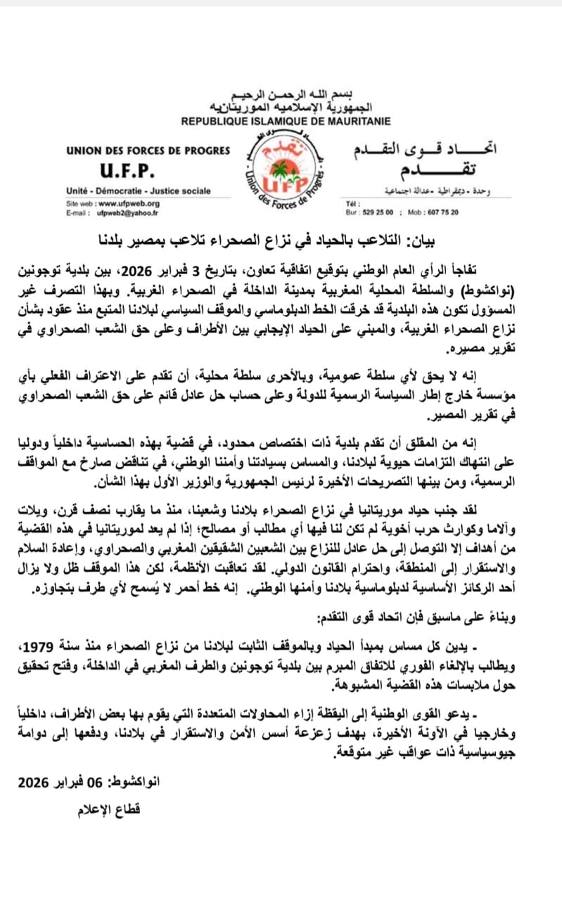 الأخبار (نواكشوط) - أدان حزب اتحاد قوى التقدم كل خطوة تشكل مساسا بمبدأ الحياد الثابت لموريتانيا في نزاع الصحراء منذ سنة 1979، مطالبا بإلغاء اتفاقية بلدية توجنين والطرف المغربي في الداخلة.