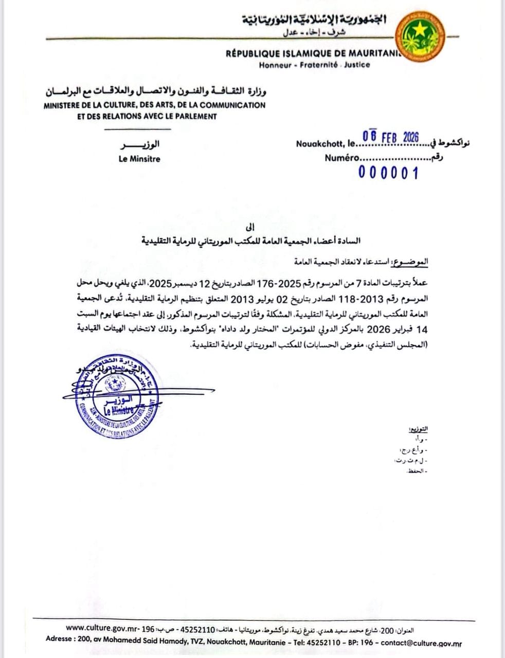 الأخبار(نواكشوط) - وجهت وزارة الثقافة والفنون والاتصال والعلاقات مع البرلمان اليوم الجمعة دعوة للجمعية العامة للمكتب الموريتاني للرماية التقليدية، وذلك من أجل عقد الجمعية العامة لانتخاب هيئاته القيادية.